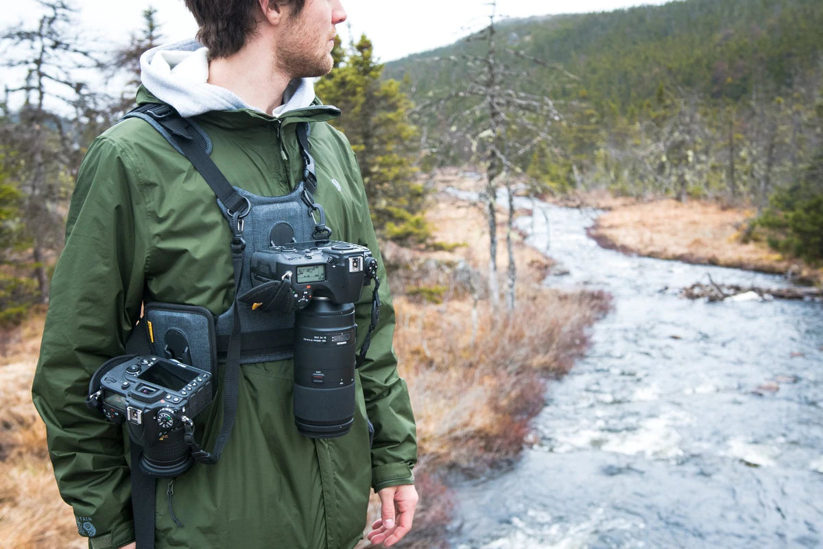 CCS G3 Camera Harness System for two cameras - Charcoal Gray.  This dual camera harness is designed for the active photographer. The harness and side holster supports and secures two cameras and lenses. Work for longer periods of time without needing to go back to a camera bag for more gear. The ergonomic design of this double camera vest distributes the weight of the cameras helping to lessen the fatigue of a long shooting day.