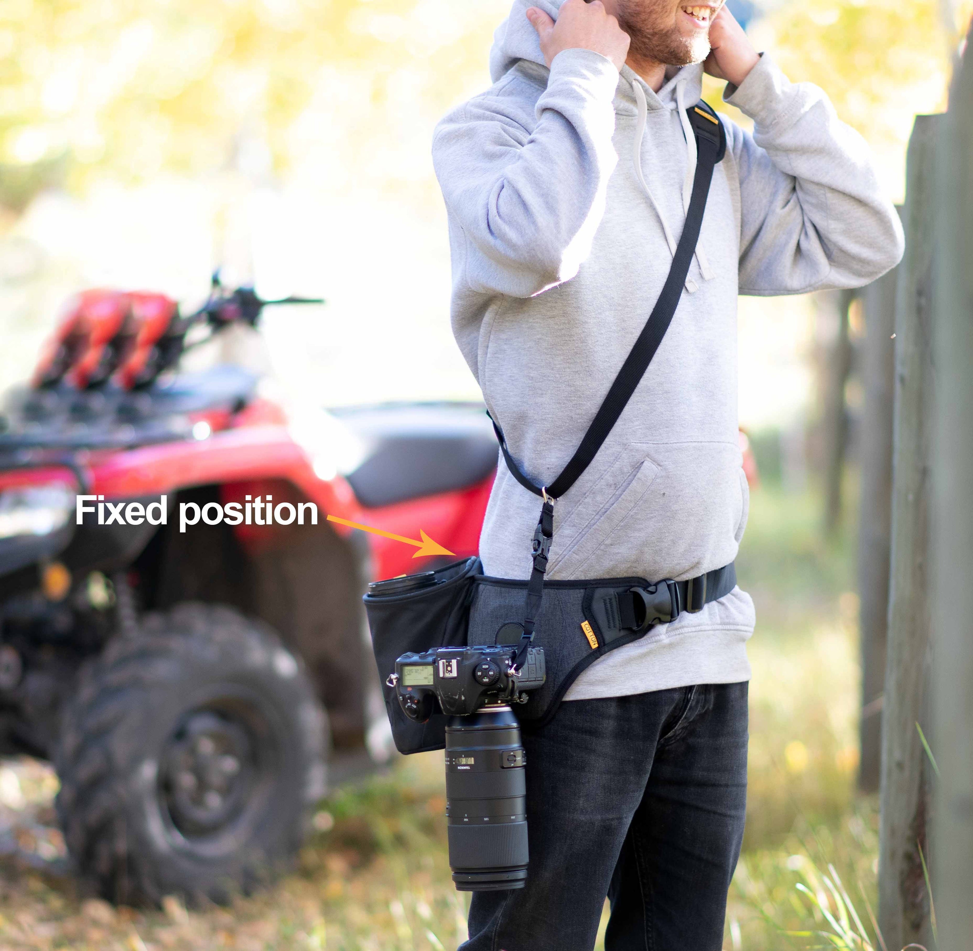 The advantage of the SlingBelt is its fixed-position carrying system. Our patented Twist & Lock mount secures a camera or binoculars to your hip. Add a second mount with a side holster if you’d like. A quick twist and your camera is quietly deployed. Want to access your camera faster? The included Sling Tether allows your camera to hang for instant shooting.